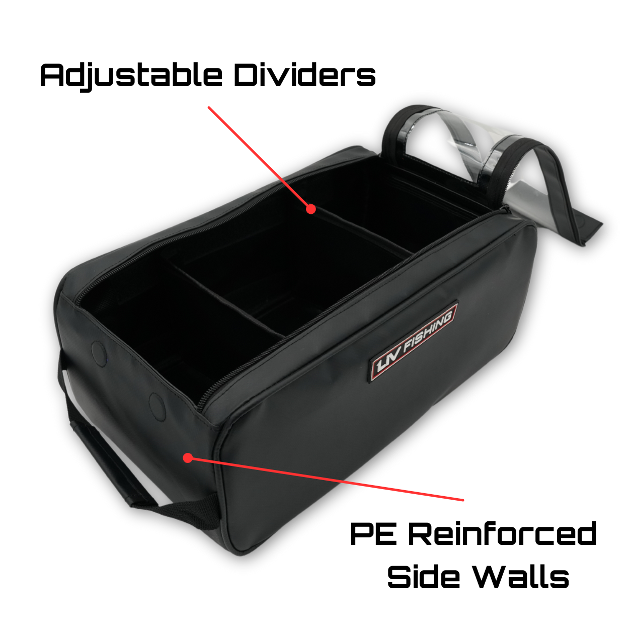 The best tackle storage bag on the market is here! The EZ Tackle Bag is built from durable, waterproof material and features a dual-zipper system with an easy-grip pull handle for quick, effortless access. A clear-view top window with a labeling area lets you note exactly what’s inside for added convenience. Inside, two adjustable dividers allow you to neatly stack your baits in organized rows, making it easy to find exactly what you’re looking for.